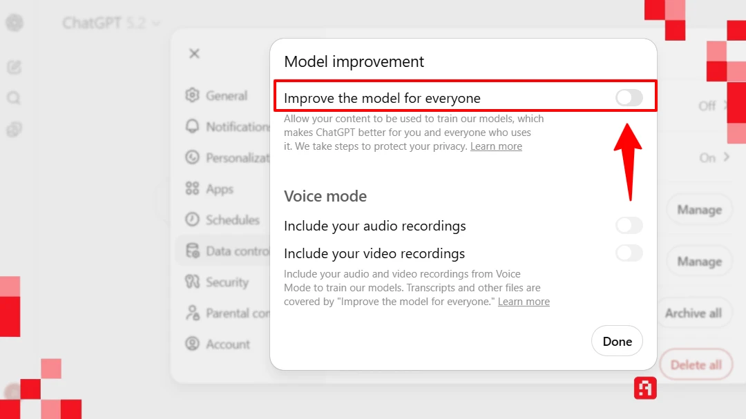 ستجد خيارًا بعنوان Improve the model for everyone. عطل زر التفعيل لإيقافه، ثم اضغط على done. عند تنفيذ هذه الخطوة، تتوقف المنصة عن استخدام محادثاتك الجديدة في تدريب النماذج.